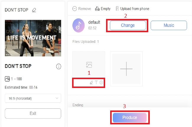 - You can also click the “Change Music” button and click the “+” icon to upload the music you want to insert on the video. After configuring the video, you can click the “Produce” button below and wait until the video will be rendered.