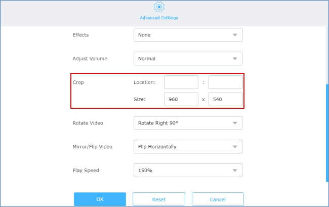 - From there, browse down until you see “Crop.” Now key in the exact location and size that you want to retain. If you wish, you can also add some effects, rotate the video, or adjust the playback speed as you prefer.