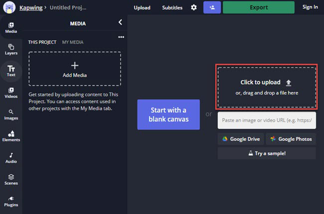 Kapwing is an online video editing tool that will help you to make an HD video from your favorite web browsers. This is a collaborative video editing program that allows you to customize a project with your friends at the same time. In addition, you can upload online videos directly by just posting the link on its URL box. Besides that, you can import media files from different cloud storages services, including Google Drive and Google Photos. Read the steps below on how you can make a cool video with this HD video maker.