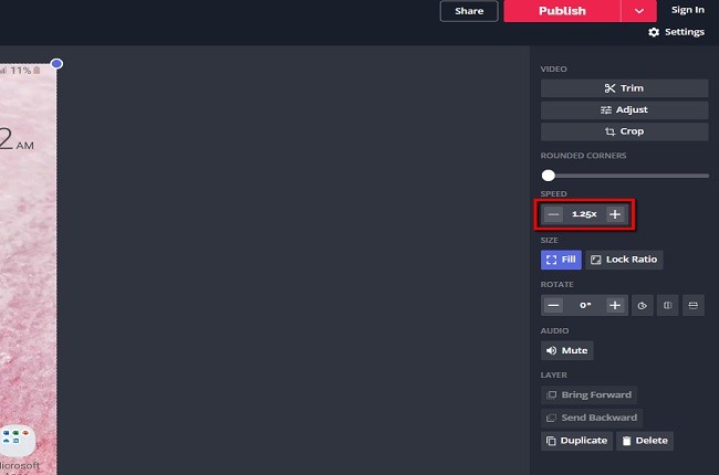 - On the right side of the interface, you can see the “Speed” option and then hit the “Plus” sign to adjust the speed of your video.